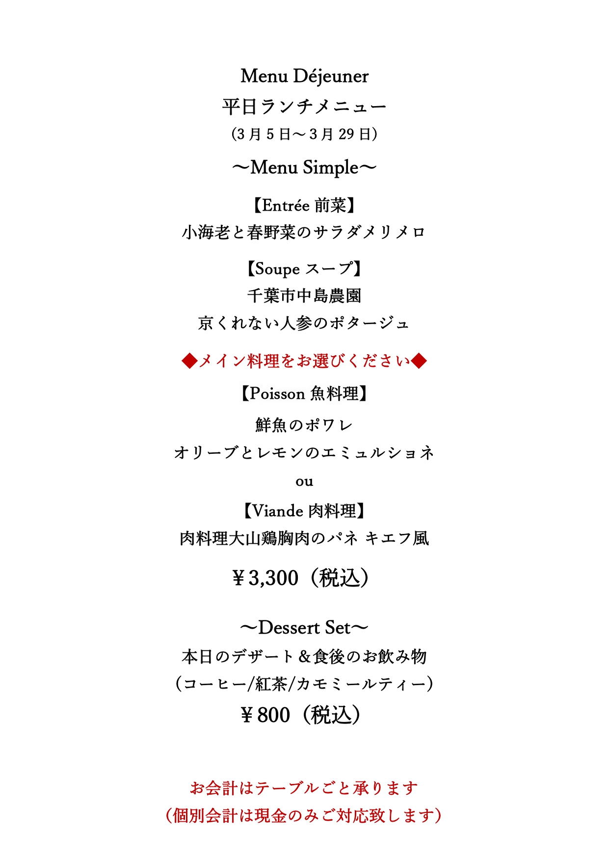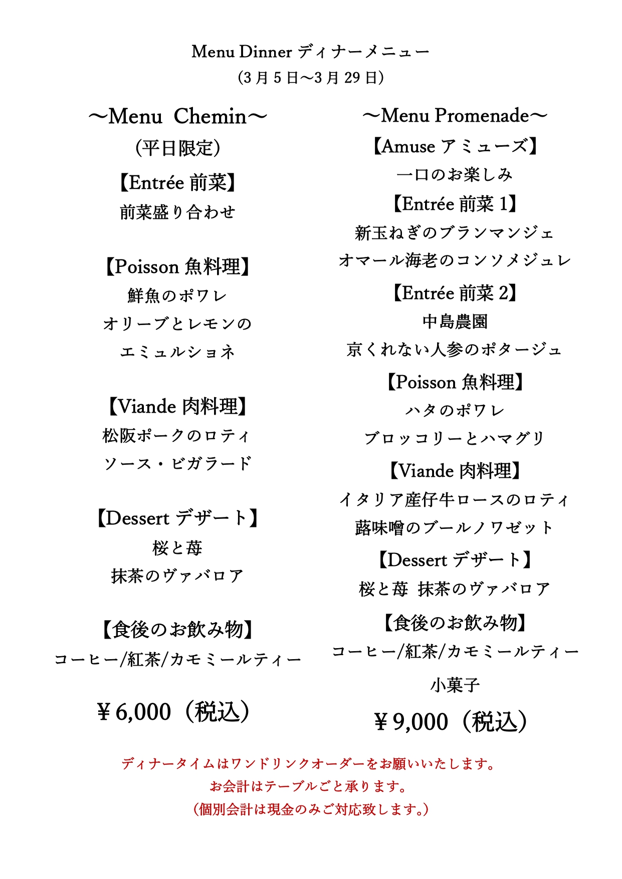 今月からディナーで、カジュアルにお楽しみいただけるMenuChemin(シュマン)と